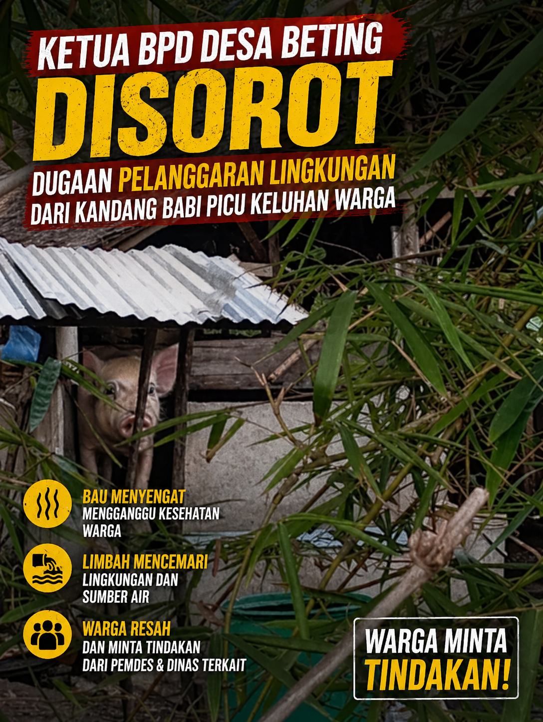 “Di sini ada sekitar lima rumah. Jarak kandang itu kurang lebih hanya 100 meter dari rumah kami, dan baunya sangat mengganggu,” ujar Abeng, salah satu warga, saat dikonfirmasi.
